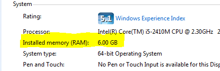So, how do you find out if you have enough or not? Well, operating systems are quite good at making sure your memory is used efficiently, but if there isn’t enough of it, they will use your hard disk to page blocks in and out of your RAM. This has an impact on performance which means you should always err on having more RAM than your computer can use. As a rule of thumb, if you’re using Windows and have more than 2Gb of RAM you’re probably ok. If you have less, an upgrade will probably help. To find out how much RAM you have, click on your Start button, right-click on Computer and choose Properties. You will see a dialog box with a section like this: